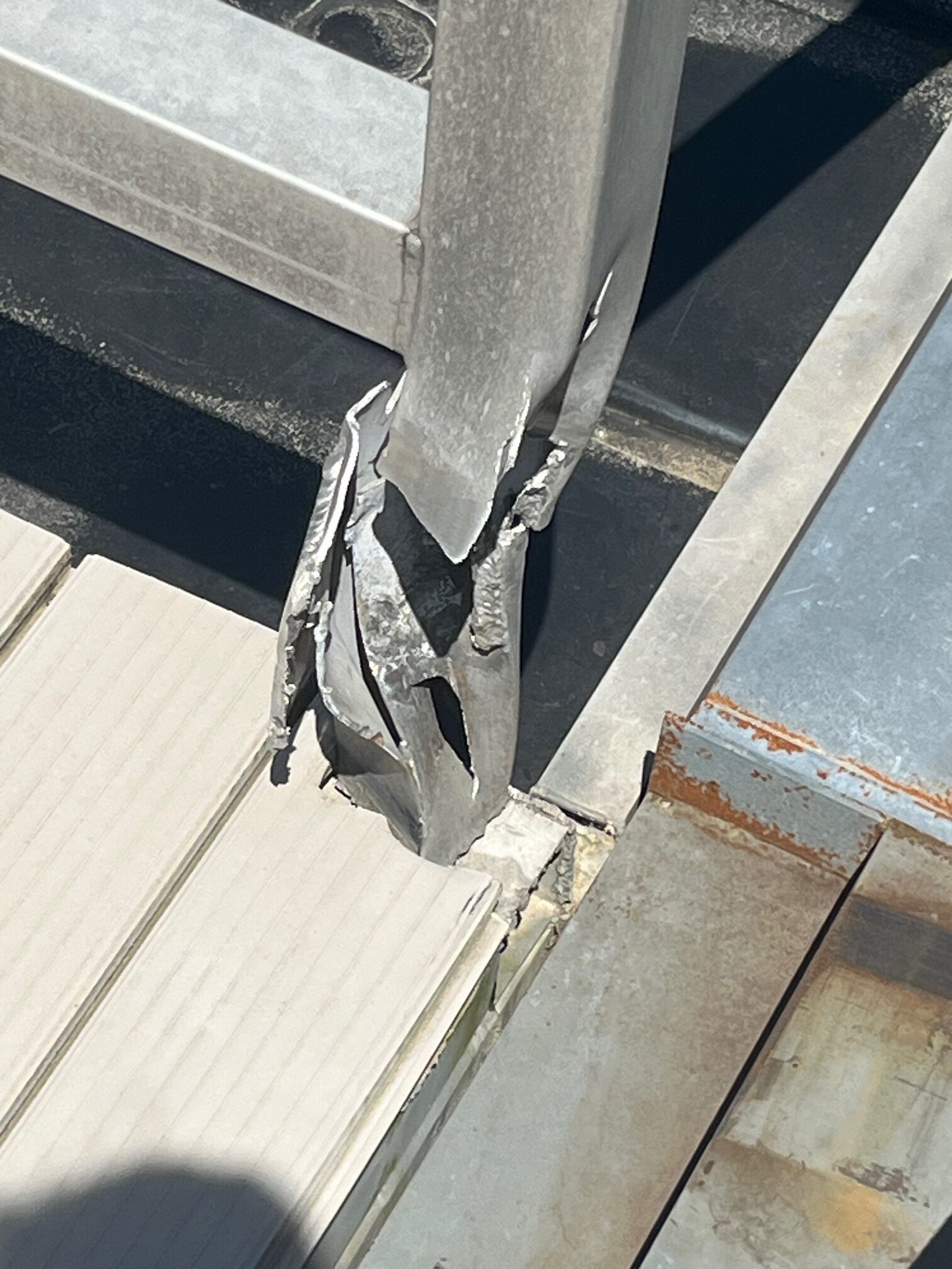 The right side hand rail at the bottom of the walkway continues to get damaged as the dock shifts from side to side and is now quite dangerous. See attached image. This continues to be an issue. I looked at the other 2 docks and there is no handrail on the platform. Suggest we have this one removed and made safe before someone gets cut badly.